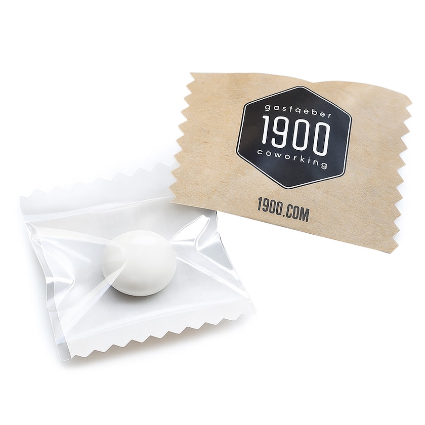 Chicle de Mentos en bonito envoltorio flowpack. Elige entre sabor menta o fruta. La parte superior del envoltorio se personaliza con tu diseño con impresión digital. La parte posterior es transparente.