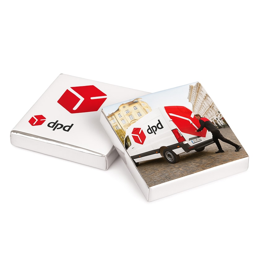 Chocolatina ecológica con Certificado de Comercio Justo. Elige entre chocolate con leche y chocolate negro. También puedes elegir el color del envoltorio interior en plateado o dorado.