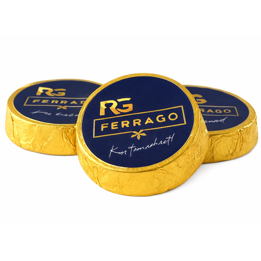 Chocolatina redonda con envoltorio dorado. La impresión se realiza en la etiqueta que se coloca en la parte superior. La chocolatina tiene un contenido de cacao del 50% y es de gran calidad. Puedes elegir el color del envoltorio plateado o dorado.