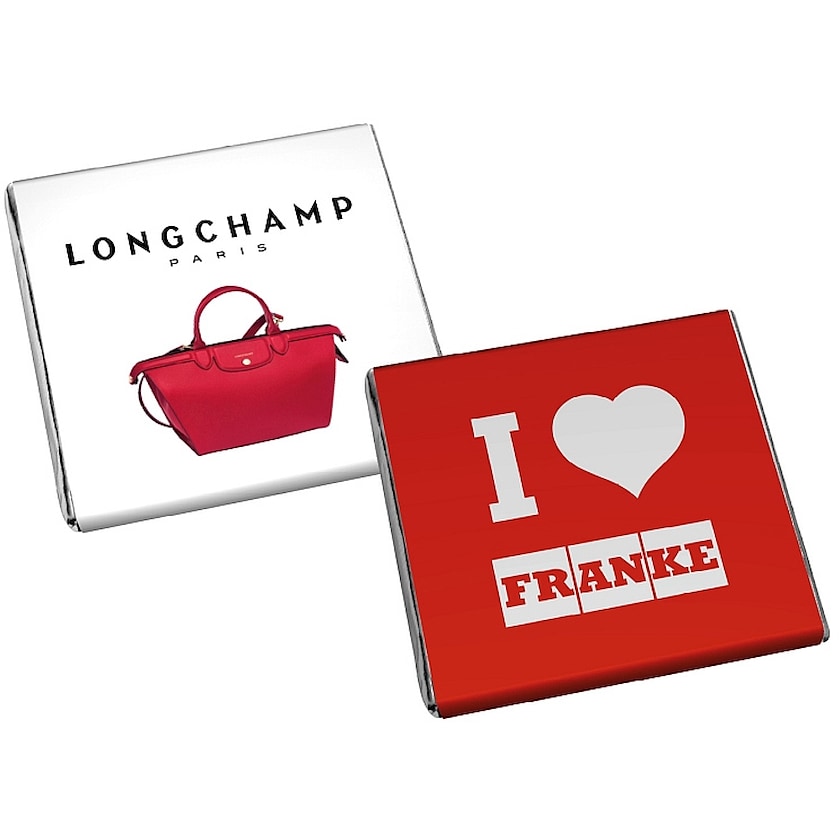 Chocolatina de 5 gramos que se puede comprar a partir de solo 2000 unidades. El chocolate es de la mejor calidad y está disponible en chocolate blanco, chocolate negro y chocolate con leche. El envoltorio se puede pedir en plateado, dorado, negro, azul o rojo. El marcado se realiza con impresión digital.
