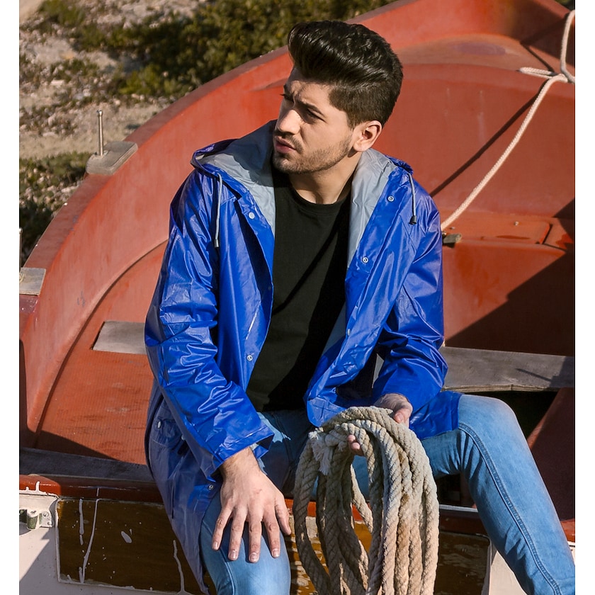 Chubasquero resistente de buena calidad. El chubasquero tiene botones de presión y dos bolsillos en la parte frontal. Solo es posible realizar la impresión en 1 color. Compra chubasqueros personalizados en Axon Profil.