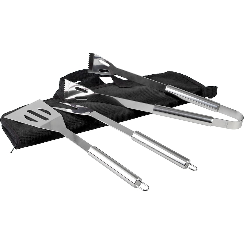 Juego para barbacoa con tenedor para asados, espátula y pinzas en acero inoxidable. El set viene en una práctica funda protectora con cremallera.
