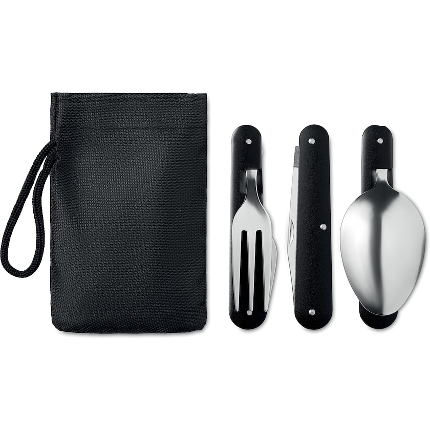Cubiertos de camping de acero inoxidable. El set contiene cuchara, tenedor y cuchillo. Se entrega en una funda negra. La impresión se realiza en la funda.