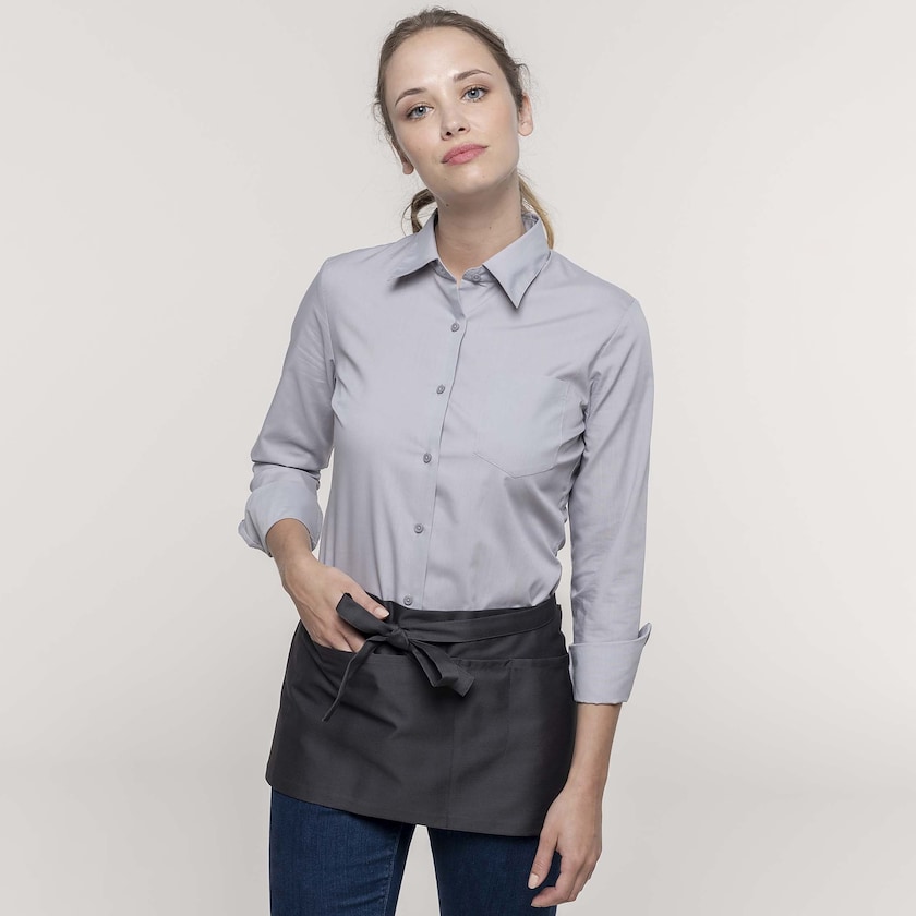 Delantal corto disponible en varios colores. El delantal está fabricado con una mezcla resistente de poliéster. Tiene un gran bolsillo frontal y otro bolsillo más pequeño con dos espacios. El delantal tiene 62,5 cm de largo y 90 cm de ancho.