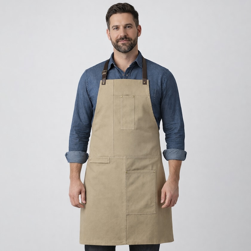 Delantal de diseño elegante de algodón. Las correas son de cuero sintético. En la parte delantera tiene un bolsillo grande y otro pequeño.