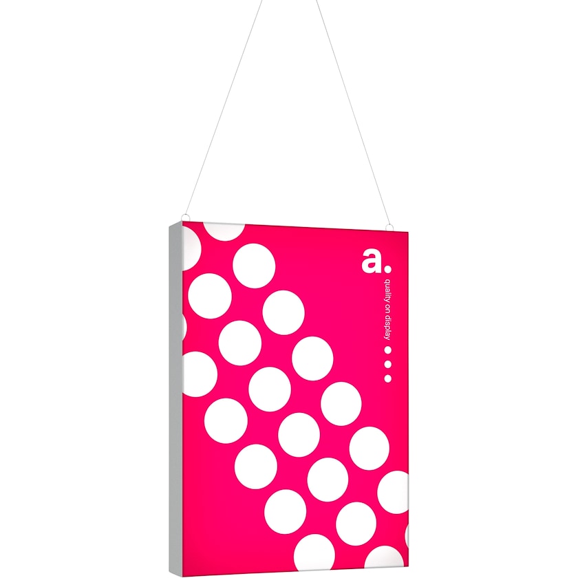 Display luminoso publicitario pequeño que se cuelga del techo. Este display publicitario se ilumina con un sistema de luces LED de última generación que garantiza que todo el diseño quede bien iluminado. El diseño se imprime sobre un tejido de poliéster con un método de impresión especial que garantiza la visión nítida de los detalles y los colores. Tu diseño se coloca en ambos lados del display. Si quieres cambiar el diseño en algún momento, solo tendrás que comprarnos un nuevo tejido personalizado. El montaje es rápido y facil.