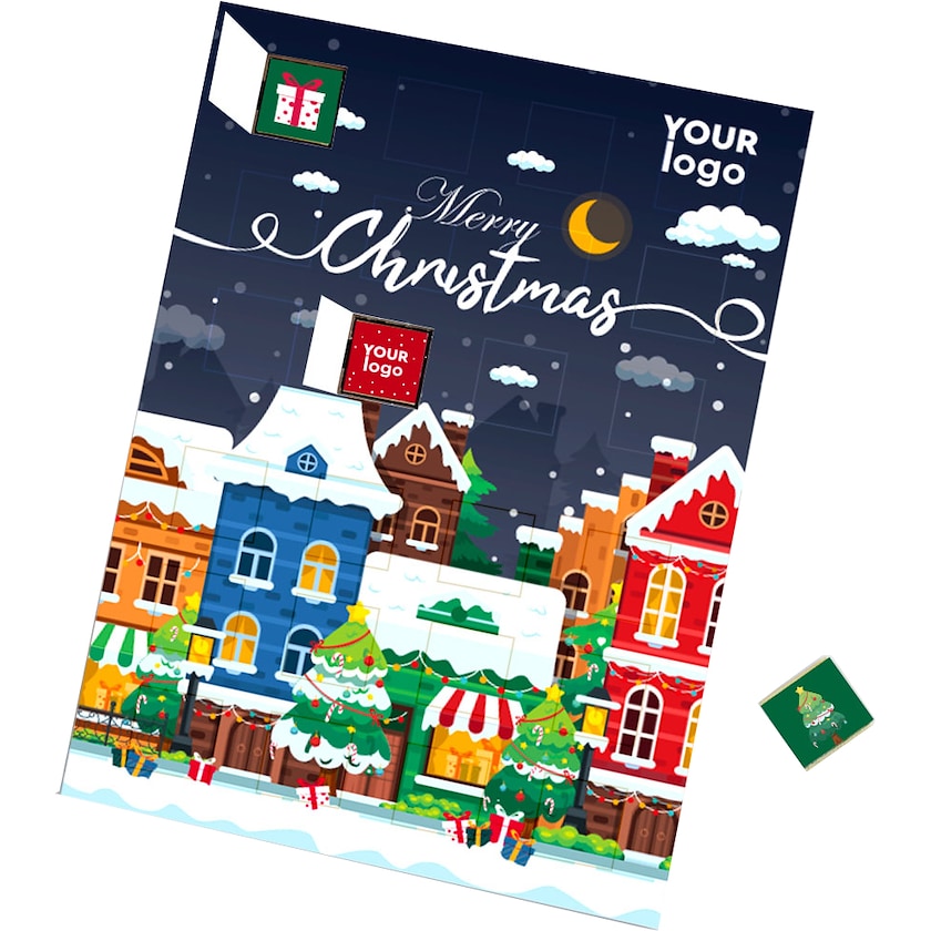 Calendario de Adviento personalizado con chocolatinas. Tanto el calendario como las chocolatinas se personalizan con tu diseño. Podrás crear un calendario de Adviento completamente único y con un chocolate delicioso. Los cuadrados de chocolate pueden ser de chocolate con leche o de chocolate negro.