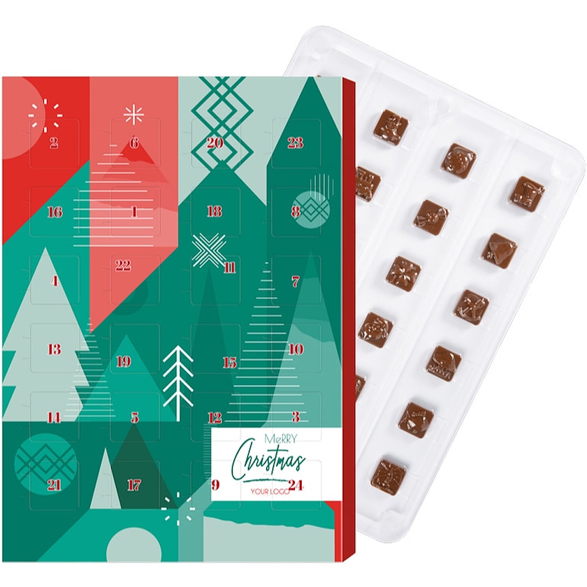 Un calendario con impresión digital de tamaño mini. El calendario de adviento contiene 24 chocolatinas de chocolate negro o chocolate con leche.