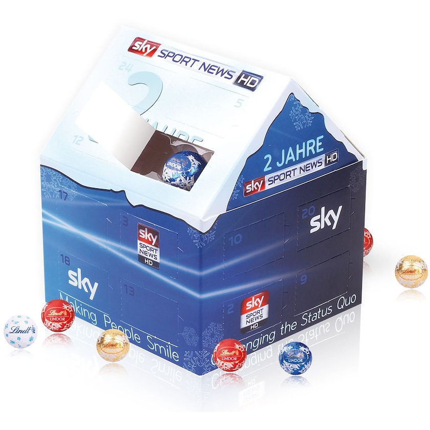 Calendario de Adviento 3D con forma de casa lleno de chocolate Lindt. Descarga la plantilla de impresión y diseña un calendario de Adviento único. El calendario cuenta con 24 Lindt Minis de una variedad de sabores.