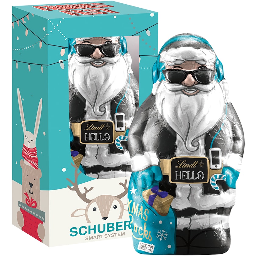 Bonito papá noel de chocolate de la colección Lindt Hello. Este Santa Claus es de delicioso chocolate con leche de la mejor calidad. Las figuras vienen en envoltorios mezclados en azul y rojo. Todo el envase de cartón se personaliza con tu diseño.