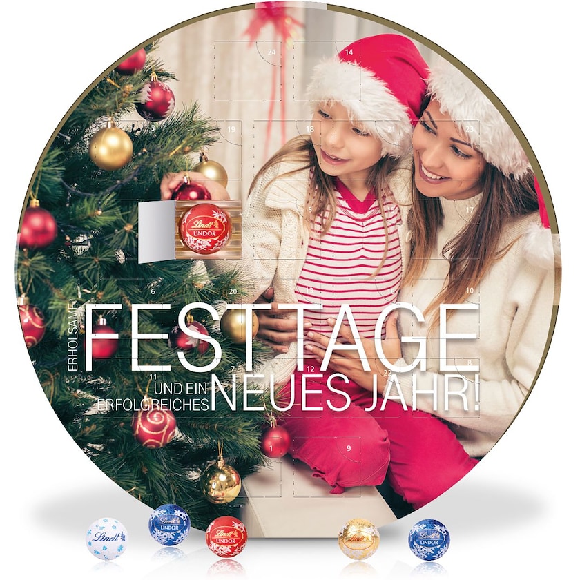 Calendario de Adviento circular con 24 chocolates Lindt Mini. El calendario está fabricado con cartón con certificado FSC que se produce de forma neutral para el clima. Descarga la plantilla de impresión y diseña tu propio calendario de Adviento.