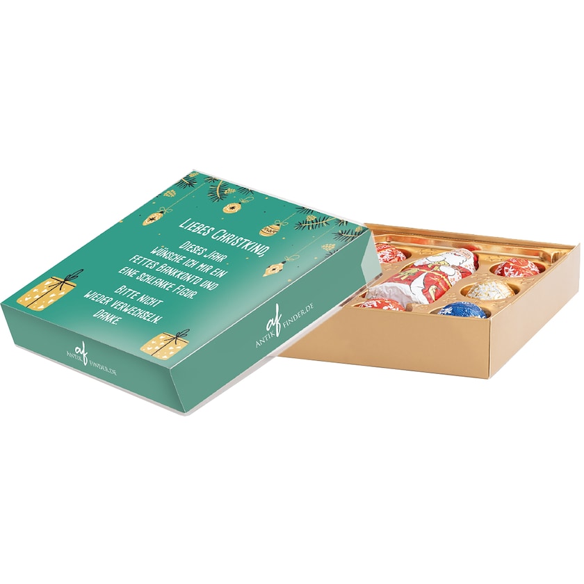 Caja de bombones de Navidad de Linds. Lindt Xmas contiene 5 bombones Lindt Lindor y un Papá Noel de chocolate Lindt. Toda la tapa se personaliza con tu diseño.