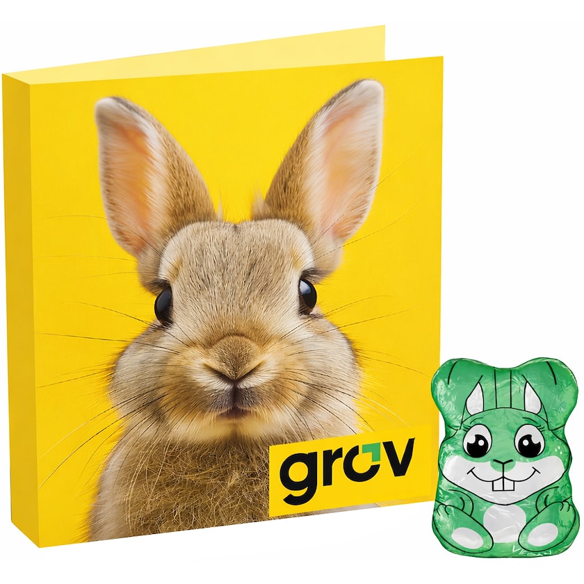 Liebre de chocolate vegana elaborada con chocolate certificado Fairtrade. El conejo de chocolate se pega en el interior de la tarjeta. Toda la tarjeta se imprime según tus instrucciones.
