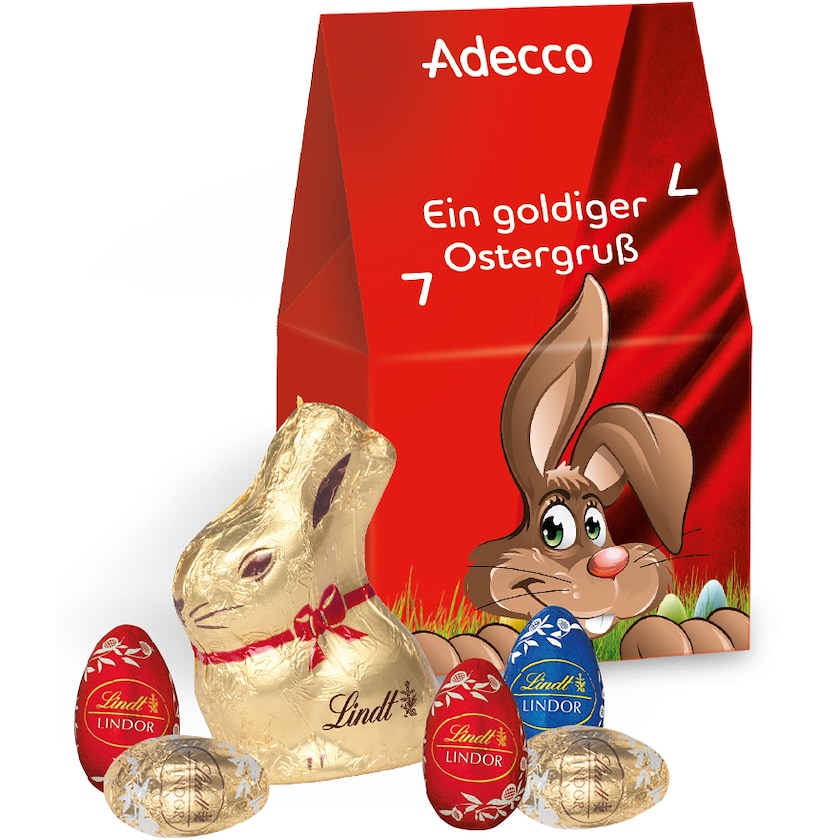 Casa personalizada llena de bombones Lindt. La casa está fabricada con papel con certificado FSC de forma neutral para el clima y se personaliza completamente con tu diseño. Gracias a su amplia superficie, hay mucho espacio para tu mensaje publicitario.