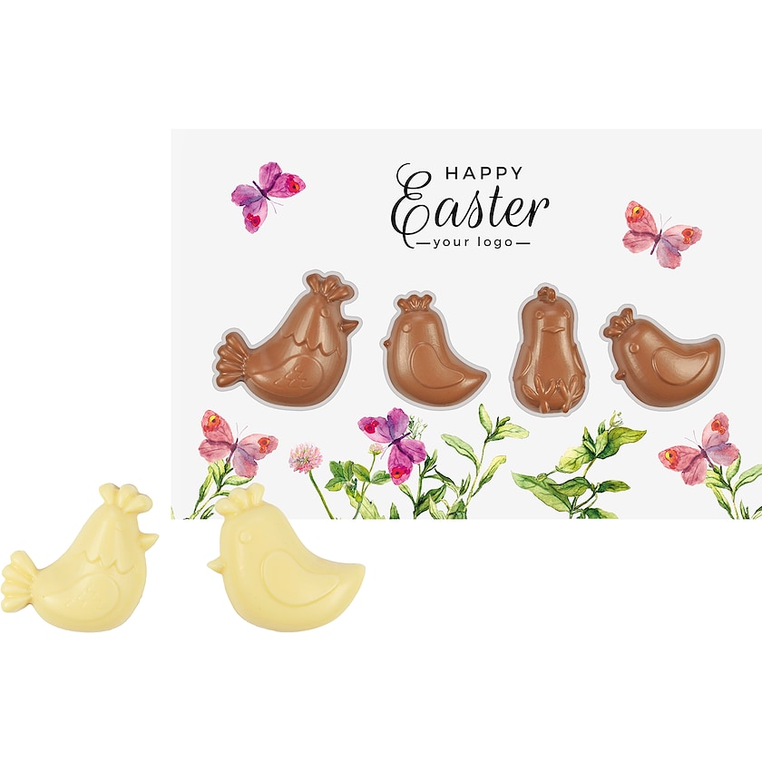 Tarjeta con cuatro gallinas de chocolate. Las chocolatinas pesan 30 gramos en total. Elige entre chocolate con leche y chocolate blanco. La tarjeta se personaliza con impresión digital.