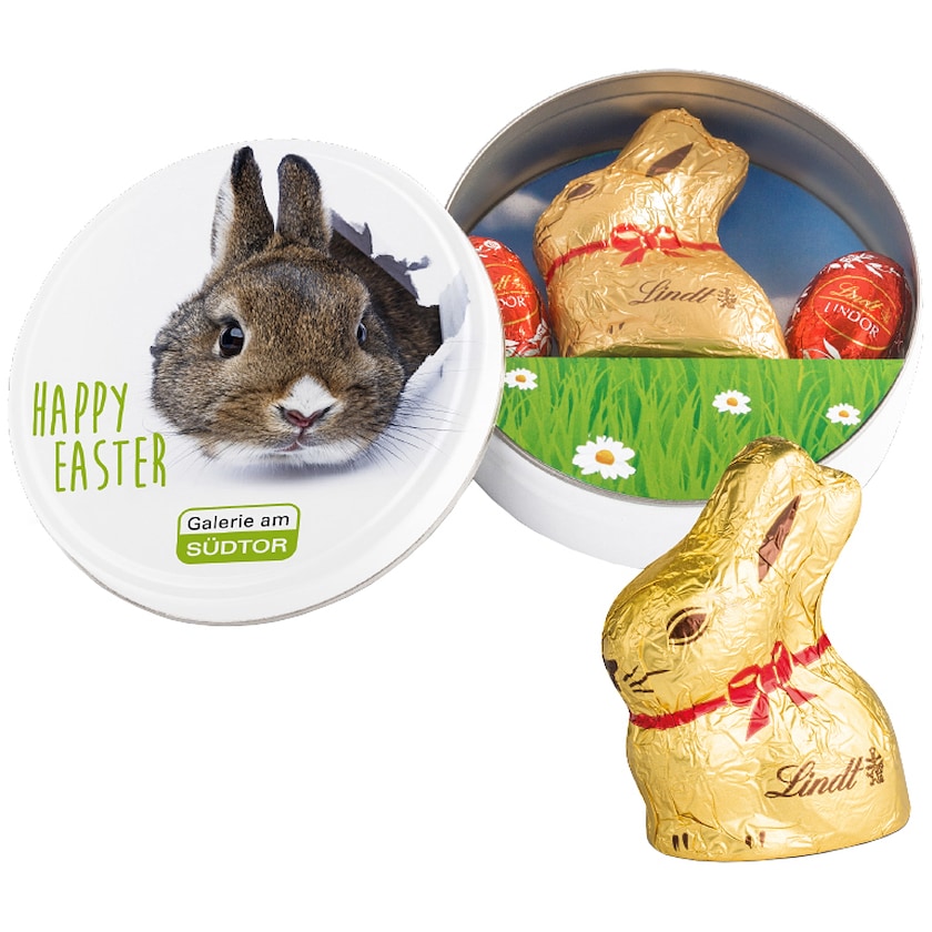 Lata llena con dulces de Pascua de Lindt. La lata tiene un conejito de Pascua Lindt de 10 gramos y dos huevos de chocolate Lindor de 5 gramos cada uno. Todo hecho con el mejor chocolate con leche suizo. La tapa de la lata se puede personalizar con tu diseño. Dentro de la lata hay un "césped" de cartón que mantiene el chocolate en su sitio.