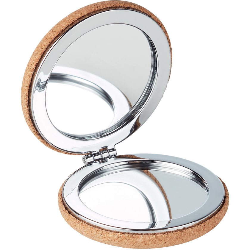 Espejo de maquillaje doble con exterior de corcho. El corcho es un material natural que da un aspecto exclusivo y único. El marcaje se puede realizar con impresión o con grabado láser.