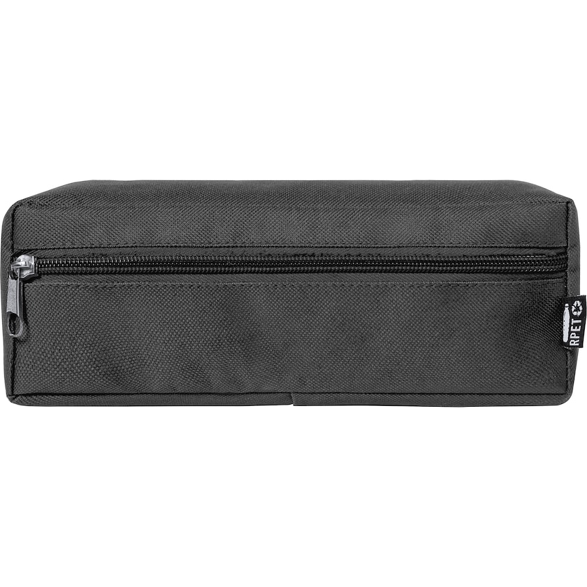 Estuche para lápices personalizado ecológico. El estuche tiene un bolsillo con cremallera. El tejido está fabricado con rPET, a partir de botellas PET recicladas.