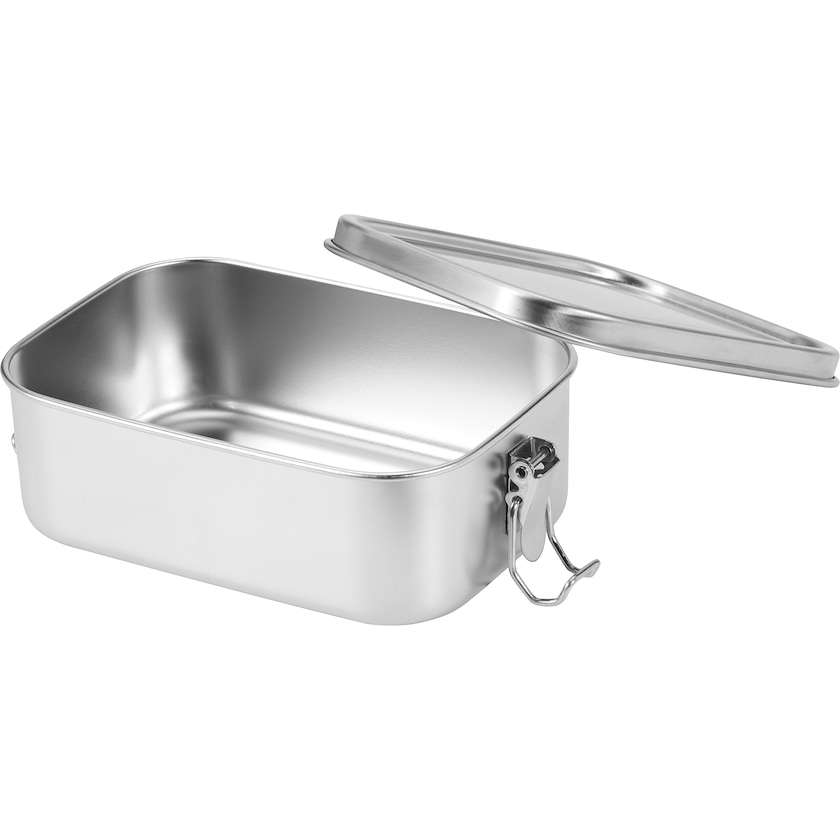 Fiambrera de acero inoxidable reciclado. El material hace que sea una fiambrera muy resistente. Apta para lavavajillas. Se entrega en una bolsa protectora de poliéster reciclado dentro de una caja de papel reciclado.