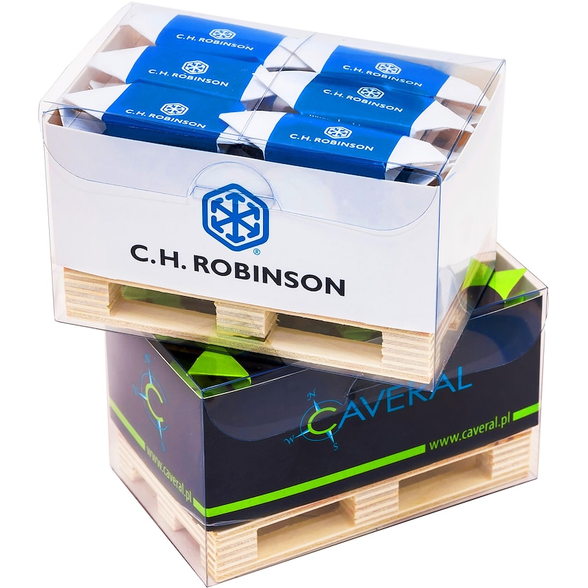 Caja de 24 caramelos fudge en formato de mini palé. Los caramelos fudge se elaboran con una receta tradicional y tienen un sabor delicioso. El envoltorio de papel de los caramelos se personaliza con impresión digital, así como la etiqueta de papel que se coloca alrededor del palé.