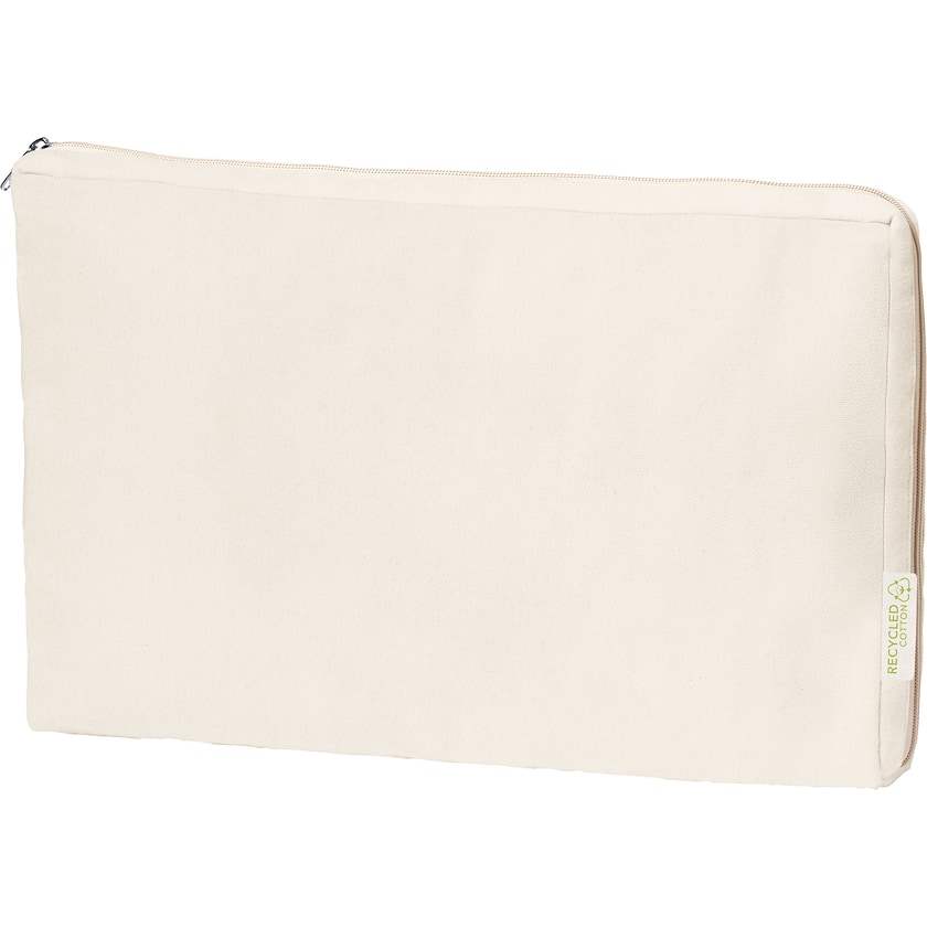 Funda para portátil personalizada de algodón reciclado. La funda Clarkson está acolchada y sirve para un portátil de hasta 15". En uno de los lados cortos tiene una etiqueta que indica que la funda está fabricada con algodón reciclado.