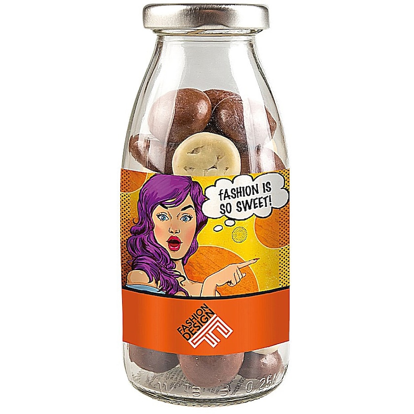 Botella de cristal con 130 gramos de galletas de tamaño mini. Contiene, entre otros, sabor a leche, chocolate blanco y postre. La etiqueta se diseña con una impresión digital personalizada. Los mejores dulces personalizados con logo.