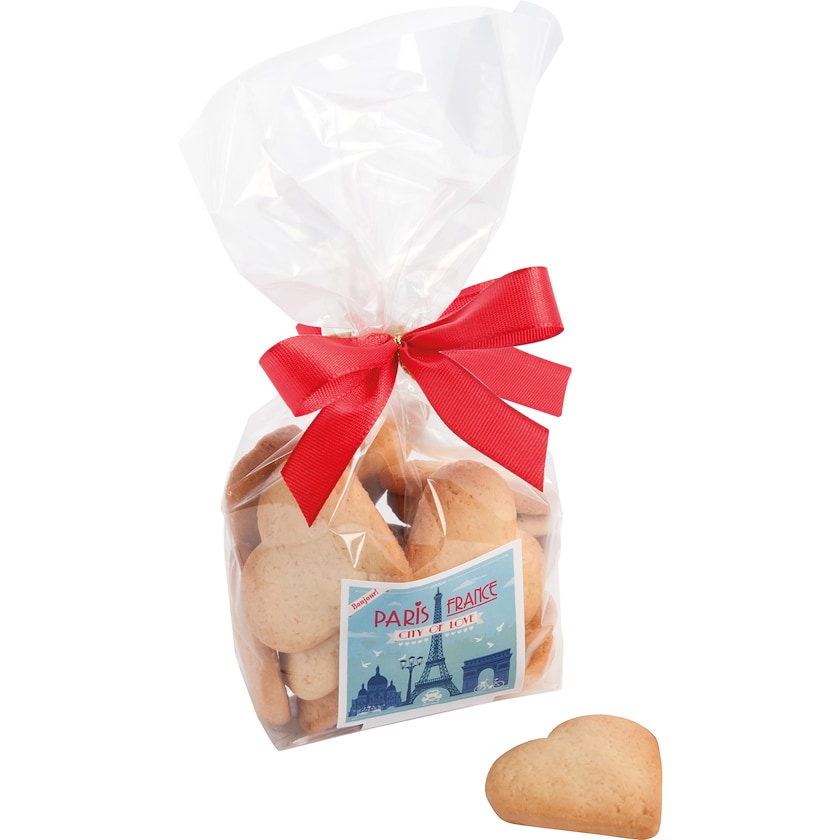 Galletas de mantequilla con forma de corazón en una bolsa con cinta. En la parte frontal de la bolsa se coloca una etiqueta con impresión digital. La cinta puede ser marrón, azul o roja.