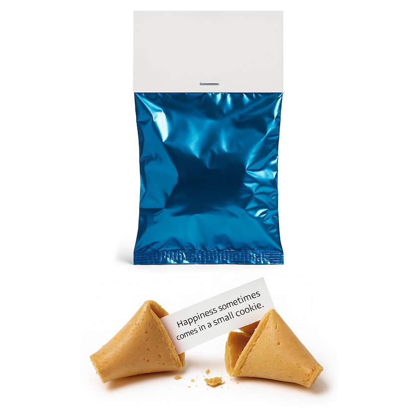 Galletas de la suerte en envoltorio con tarjeta con impresión digital. Elige entre varios colores de envoltorio diferentes. Puedes elegir hasta 5 mensajes para poner en las galletas. Cada mensaje puede tener hasta 125 caracteres incluyendo espacios. El texto se escribe en negro.