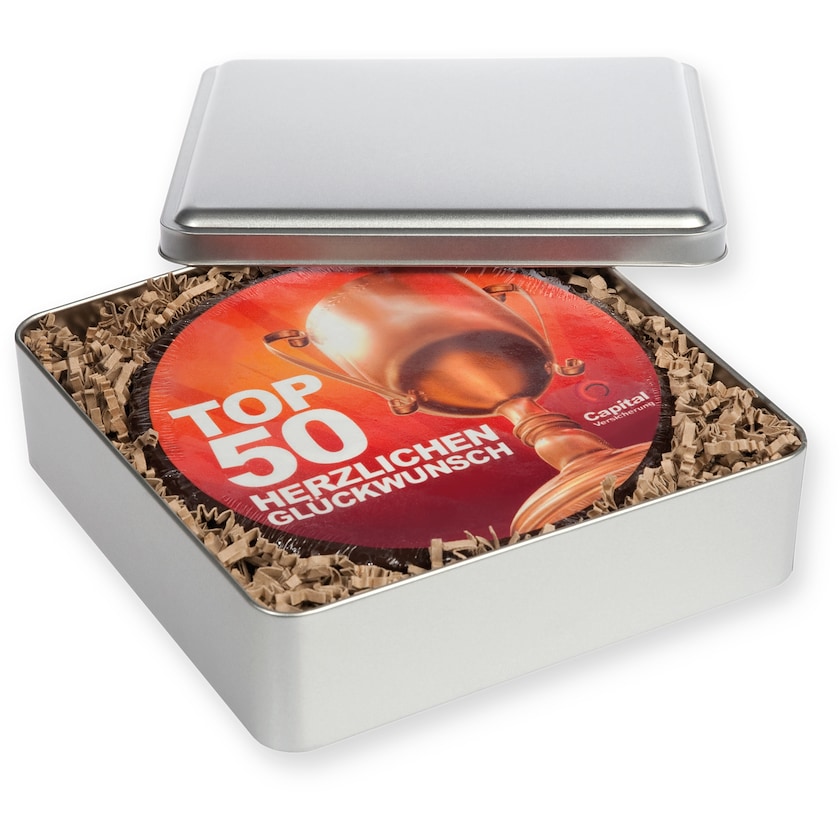 Tableta de chocolate grande con diseño personalizado. La impresión se realiza con colorantes aprobados para alimentación y con realismo fotográfico. La chocolatina viene en una bonita lata de metal.