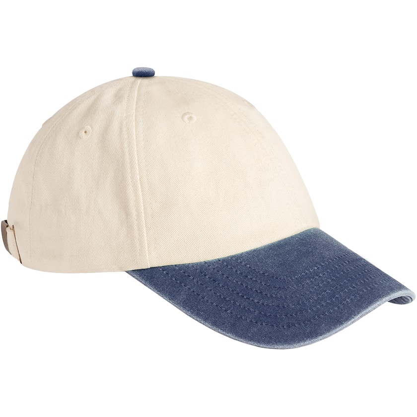 Gorra de estilo vintage con visera en color contrastante. La gorra está confeccionada con sarga de algodón de color natural y algodón teñido con acabado «heavy washed».