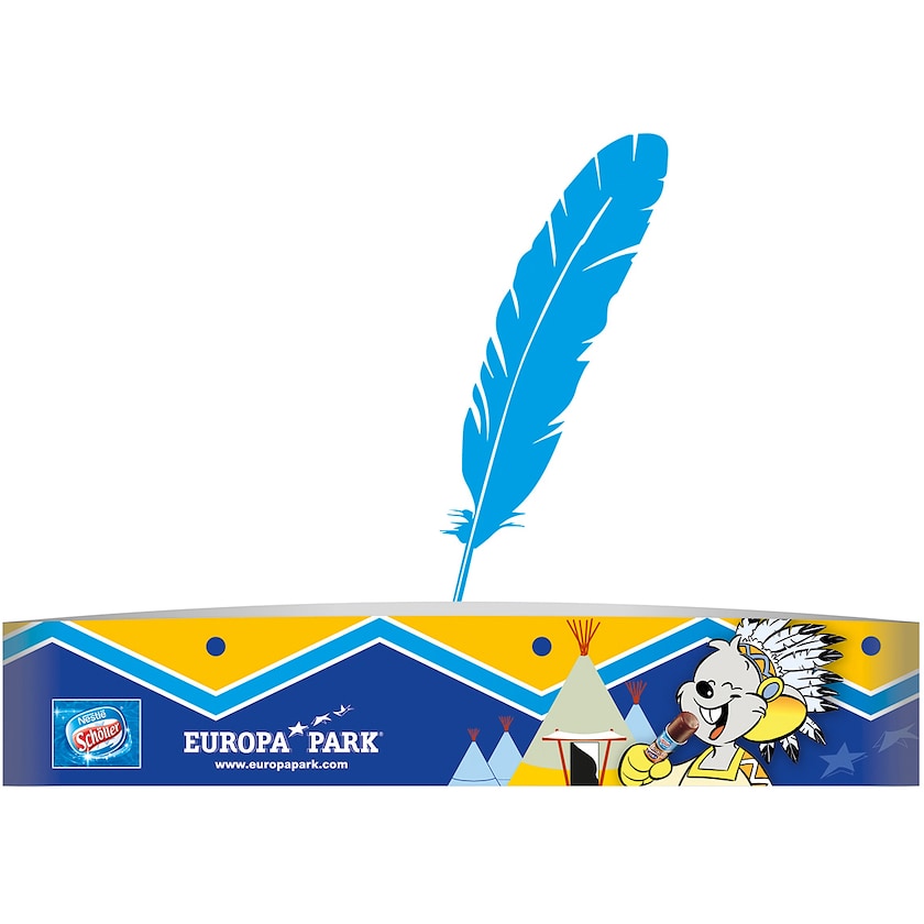 Diadema de indio hecha con papel reciclado. El papel está compuesto por un 95% de material reciclado. El interior es blanco y el exterior se personaliza con tu diseño. Se entrega plegada con plumas de colores vivos.
