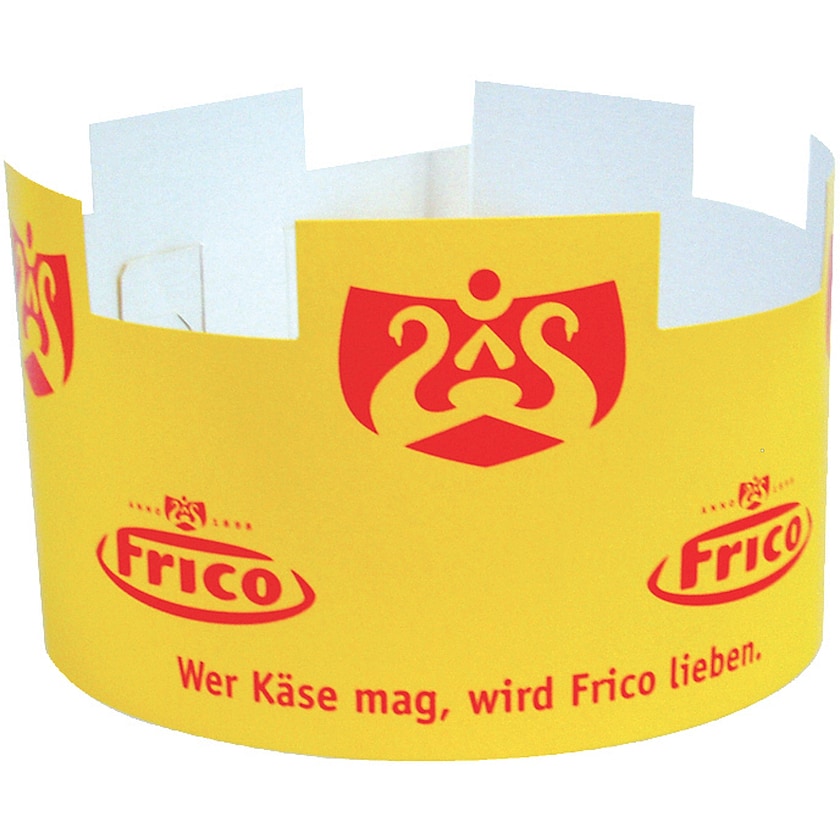 Corona de papel que se personaliza con tu propio diseño. La corona Castle está fabricada en cartón con un 95% de material reciclado. Se entregan en formato plano. La impresión se realiza en el exterior. Compra coronas de cartón personalizadas con logo en Axon Profil.