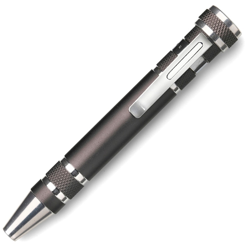 Destornillador con forma de bolígrafo con ocho puntas intercambiables.