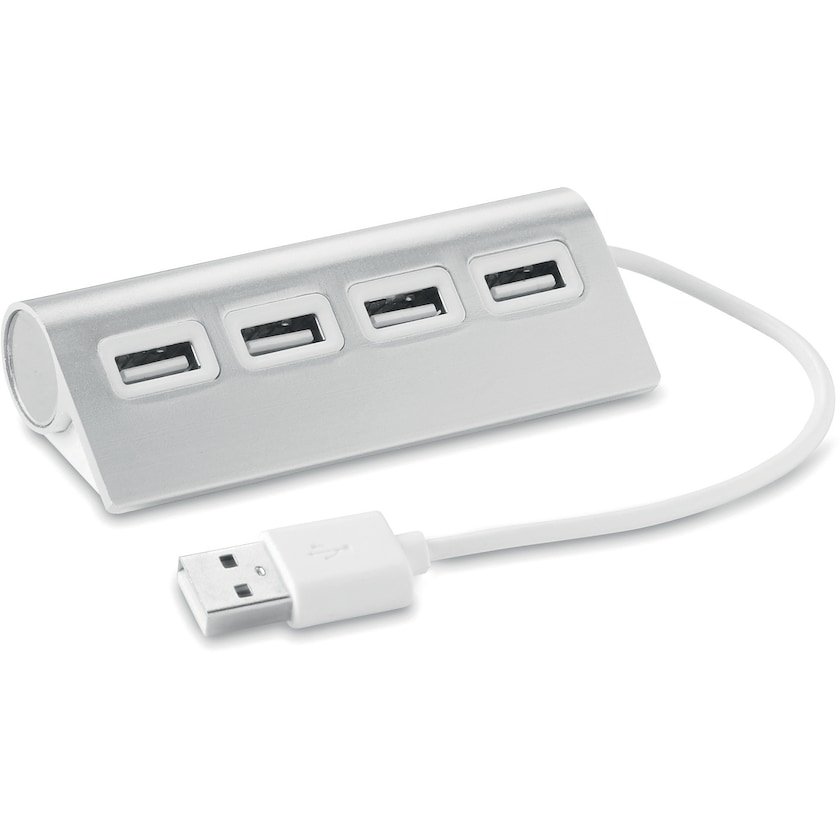 Elegante hub USB de aluminio. Bailey tiene 4 puertos USB 2.0. El cable tiene 14,5 cm de largo. El marcado se realiza con impresión o con grabado láser.