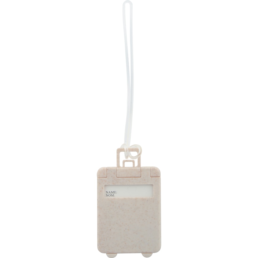Identificador de equipaje ecológico de plástico de paja de trigo. La etiqueta identificativa tiene un asa elástica larga para colocarla fácilmente en una maleta.