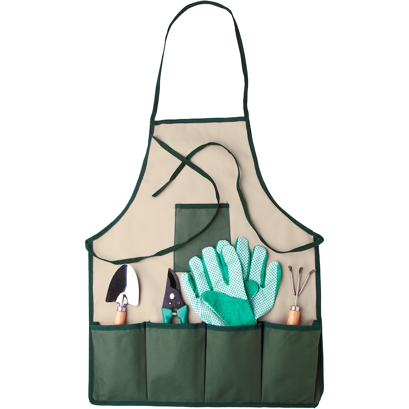 Práctico set con lo más importante para cuidar del jardín. El set contiene delantal, tijeras de podar, rastrillo, pala y un par de guantes.