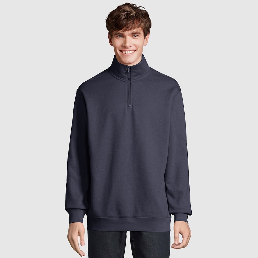 Sudadera de la marca francesa SOL's con cremallera corta. El tejido está fabricado en 80% algodón y 20% poliéster reciclado con certificado GRS a excepción del color gris jaspeado, fabricado en 73% algodón, 20% poliéster reciclado y 7% viscosa.