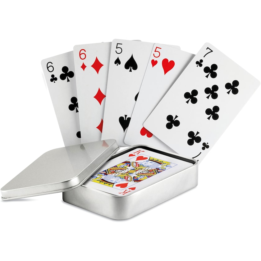 Baraja de cartas en caja metálica. La baraja contiene 54 cartas. La impresión solo se puede realizar en la caja.