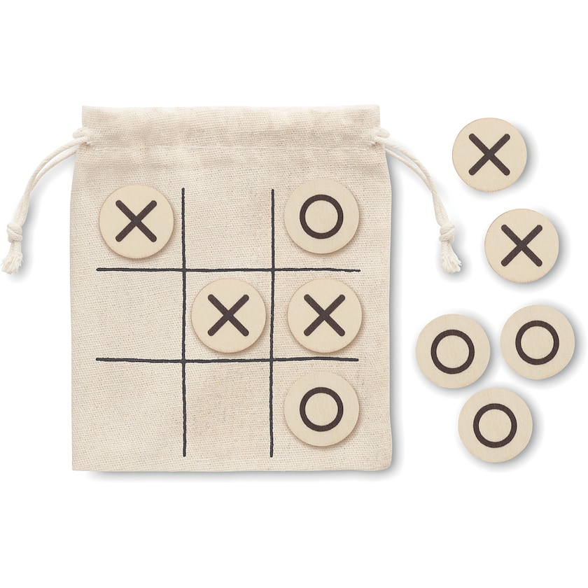 Juego de tres en raya de madera en una bolsa de algodón. Un juego divertido que puedes llevar a cualquier parte. La impresión se realiza en la bolsa.