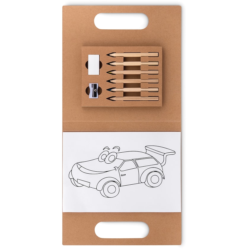 Set de dibujo para niños con buen espacio para tu logo. El set Danny contiene 30 hojas para colorear, 6 lápices de colores, 1 sacapuntas y 1 goma de borrar.