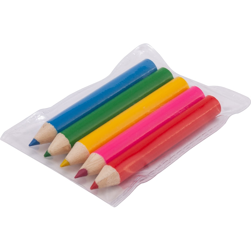 Pequeño set de 5 lápices de colores. Los lapiceros vienen en un estuche transparente que se personaliza con impresión digital.