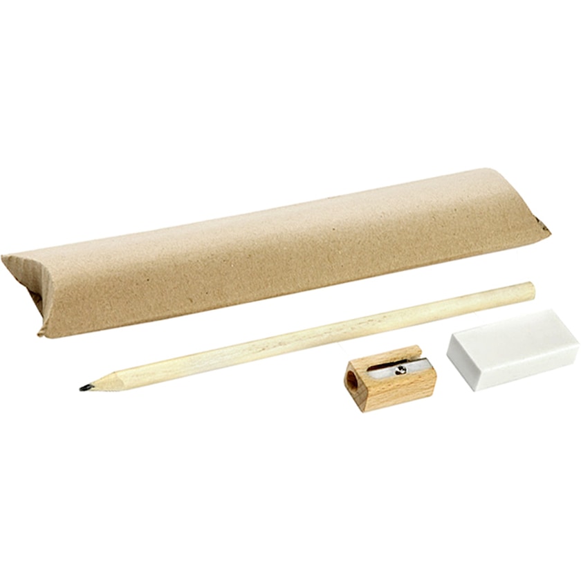 Pequeño set con lápiz, goma de borrar y sacapuntas. El juego viene en una funda de cartón de color natural.