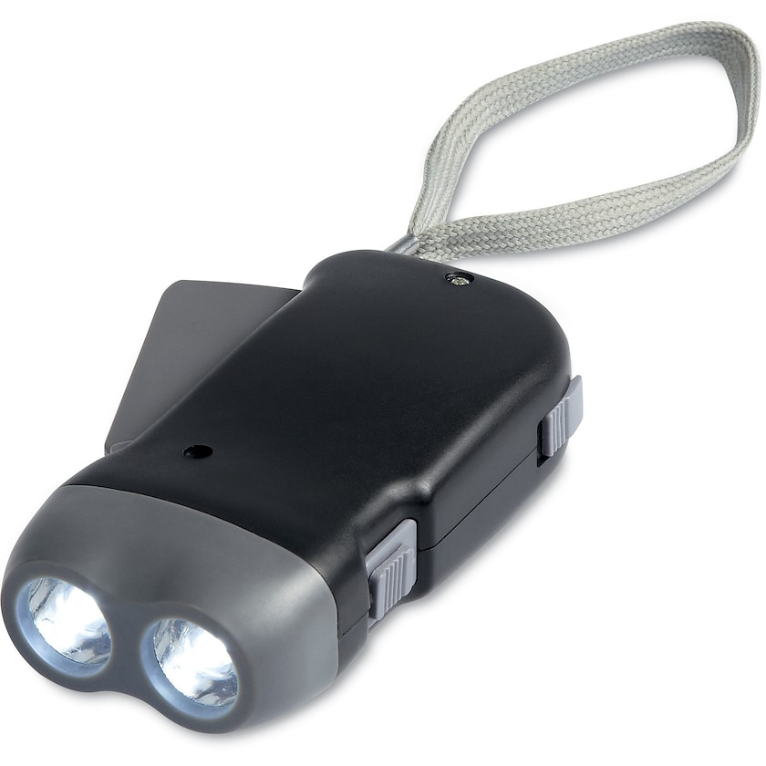 Linterna de carga manual con 2 luces LED. La linterna tiene una práctica correa. No necesita pilas porque se carga con un mecanismo manual.
