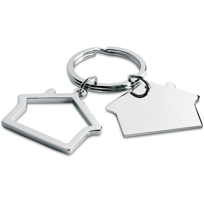 Llavero de metal con forma de casa. Se envía en una caja de regalo negra.