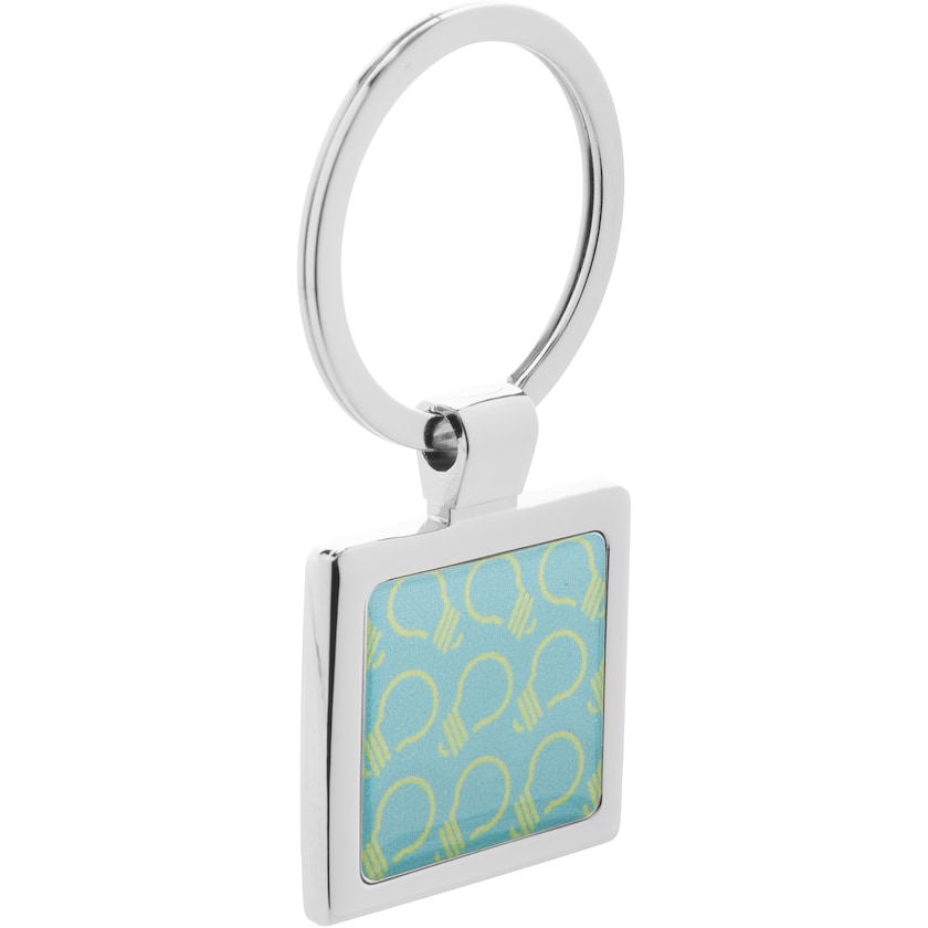 Llavero cuadrado de metal con impresión digital. Un llavero cromado con una gran superficie de impresión. Se entrega en una bonita caja de regalo.