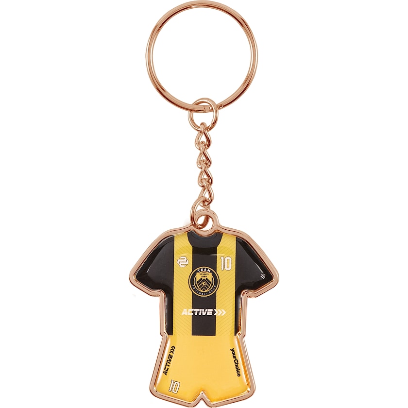Llavero con cadena diseñado en forma de uniforme de fútbol. El llavero está fabricado en metal y está disponible en colores oro, plata y bronce. Tu diseño se imprime digitalmente y se coloca bajo una capa protectora de epoxi. Los llaveros se entregan individualmente embalados en papel de seda.