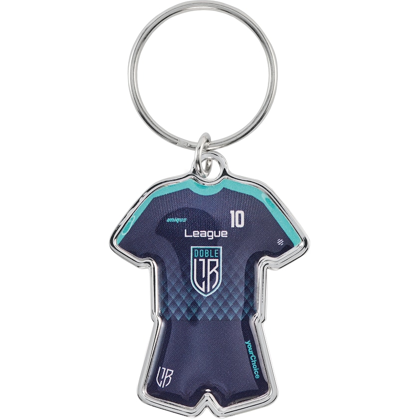 Llavero con forma de uniforme de fútbol. El llavero está fabricado en metal y está disponible en colores oro, plata y bronce. Tu diseño se imprime digitalmente y queda protegido bajo una capa de epoxi. Se entrega individualmente embalado en papel de seda.