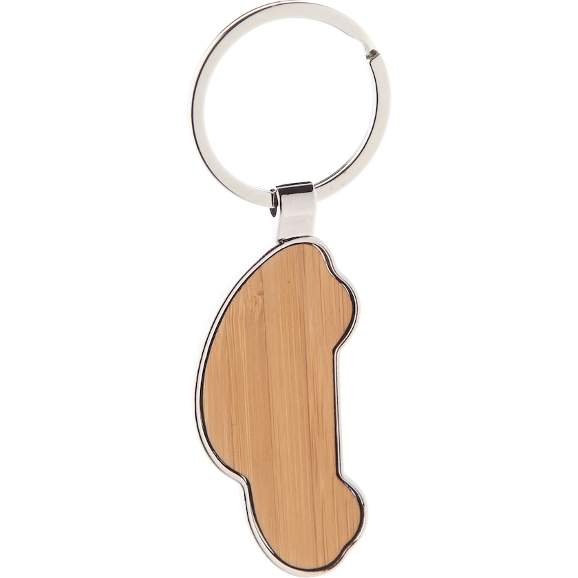 Llavero de metal y bambú con forma de coche. Se entrega en un envase de papel individual de color natural.