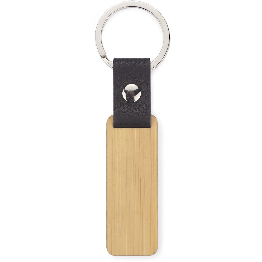 Bonito llavero de bambú, cuero y metal. Se personaliza con grabado láser.