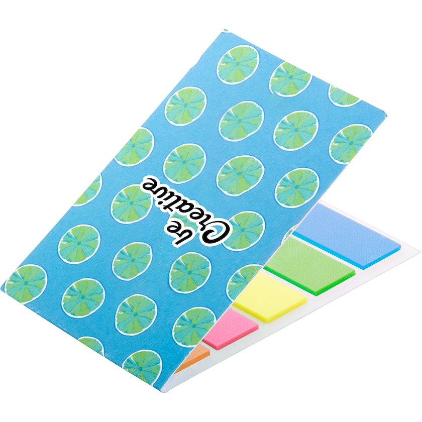 Etiquetas adhesivas en cinco colores diferentes con cubierta de papel. Hay un total de 100 etiquetas adhesivas con unas dimensiones de 44 x 12 mm. La cubierta exterior está impresa digitalmente.